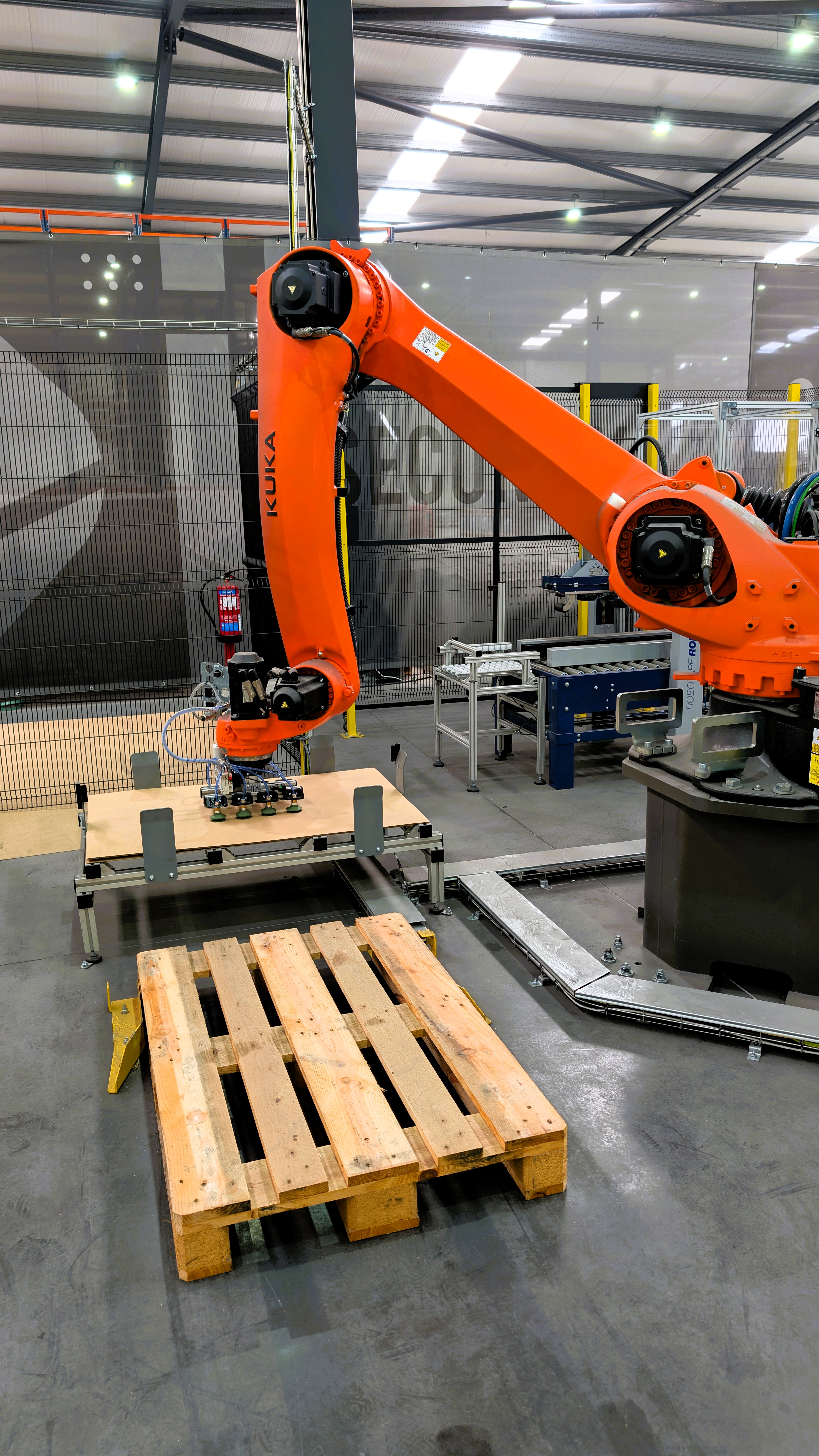 At the core of the operation, the KUKA KR 140 robotic arm ensures precise and high-speed load handling, powered by a dual-entry pallet system. This strategic configuration ensures the line never stops: while one pallet is being completed, the second is already in a waiting position, eliminating downtime.